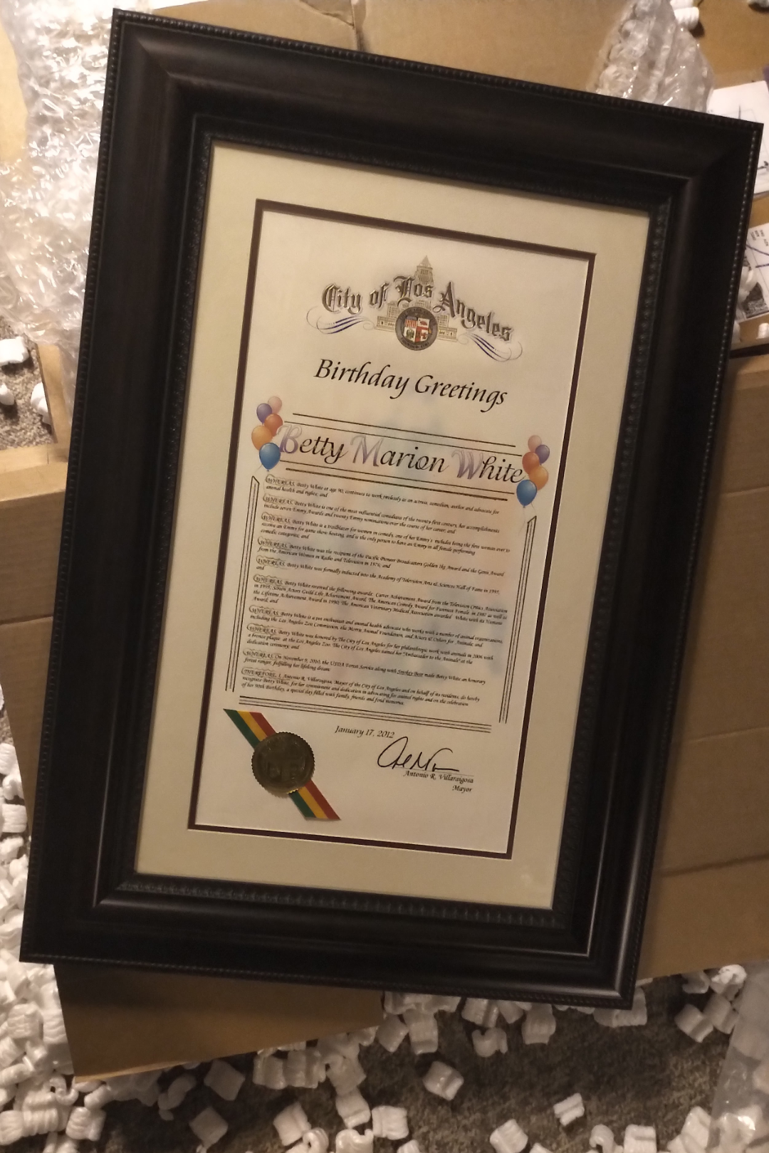 After she died, a huge box arrived from her estate. The 90th birthday commemoration from City of Los Angeles is here!